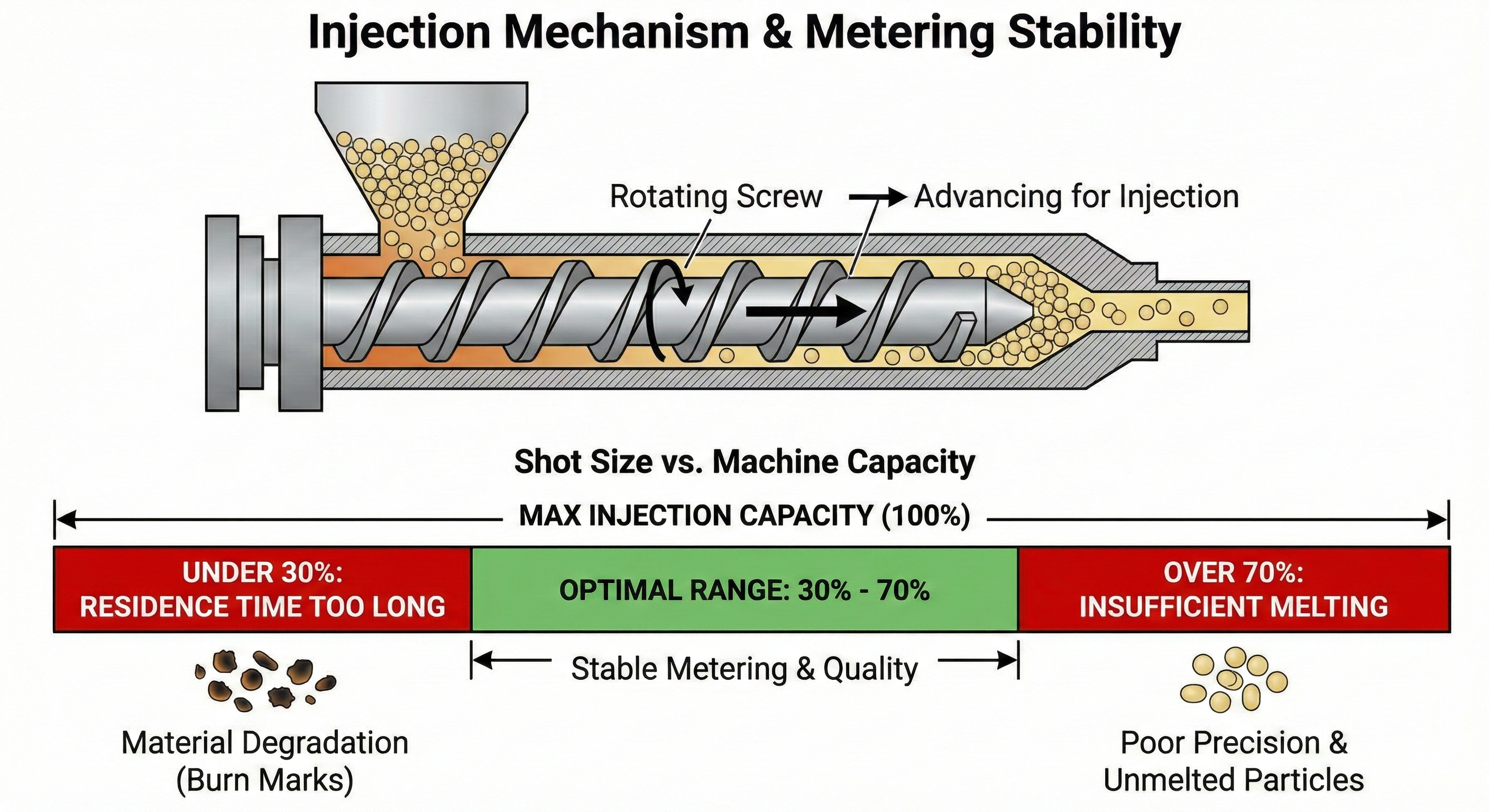 사출 장치는 스크류의 회전과 전진 운동을 통해 수지를 녹이고 밀어냅니다. 현명한 모델 선택을 위해서는 "최대 사출 용량의 30% ~ 70% 사이"에 실제 제품 중량이 위치하는 모델을 골라야 합니다. 이 범위를 벗어나면 수지가 가열 통 내부에 너무 오래 머물러 물성이 변하거나(탄화), 반대로 제대로 녹지 않은 수지가 주입되어 정밀도가 떨어지는 문제를 겪게 됩니다.