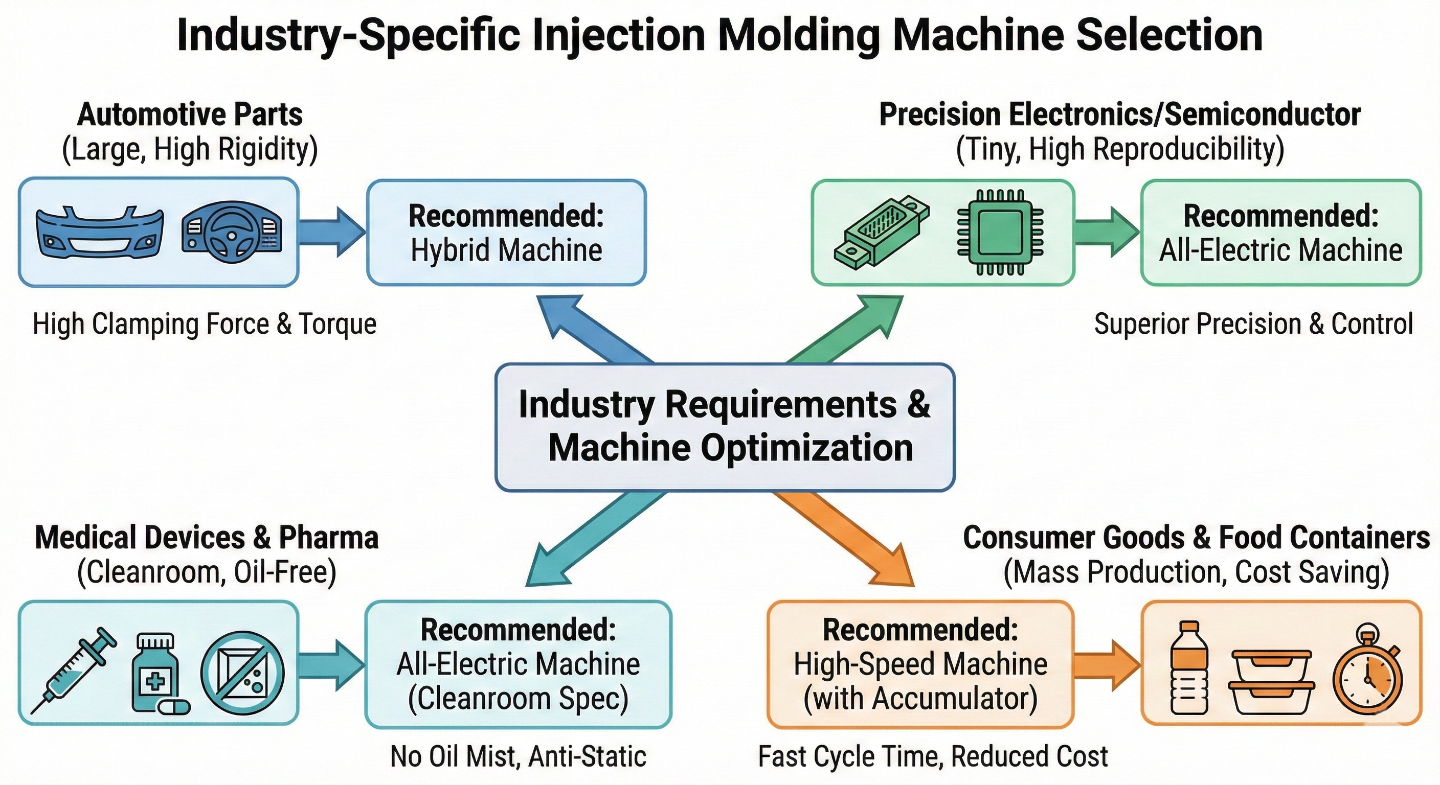 - 의료기기 및 제약: 오일 비산이 없어야 하는 클린룸 환경이 필수적이므로 전동식 사출기와 정전기 방지 사양 모델이 최우선입니다.