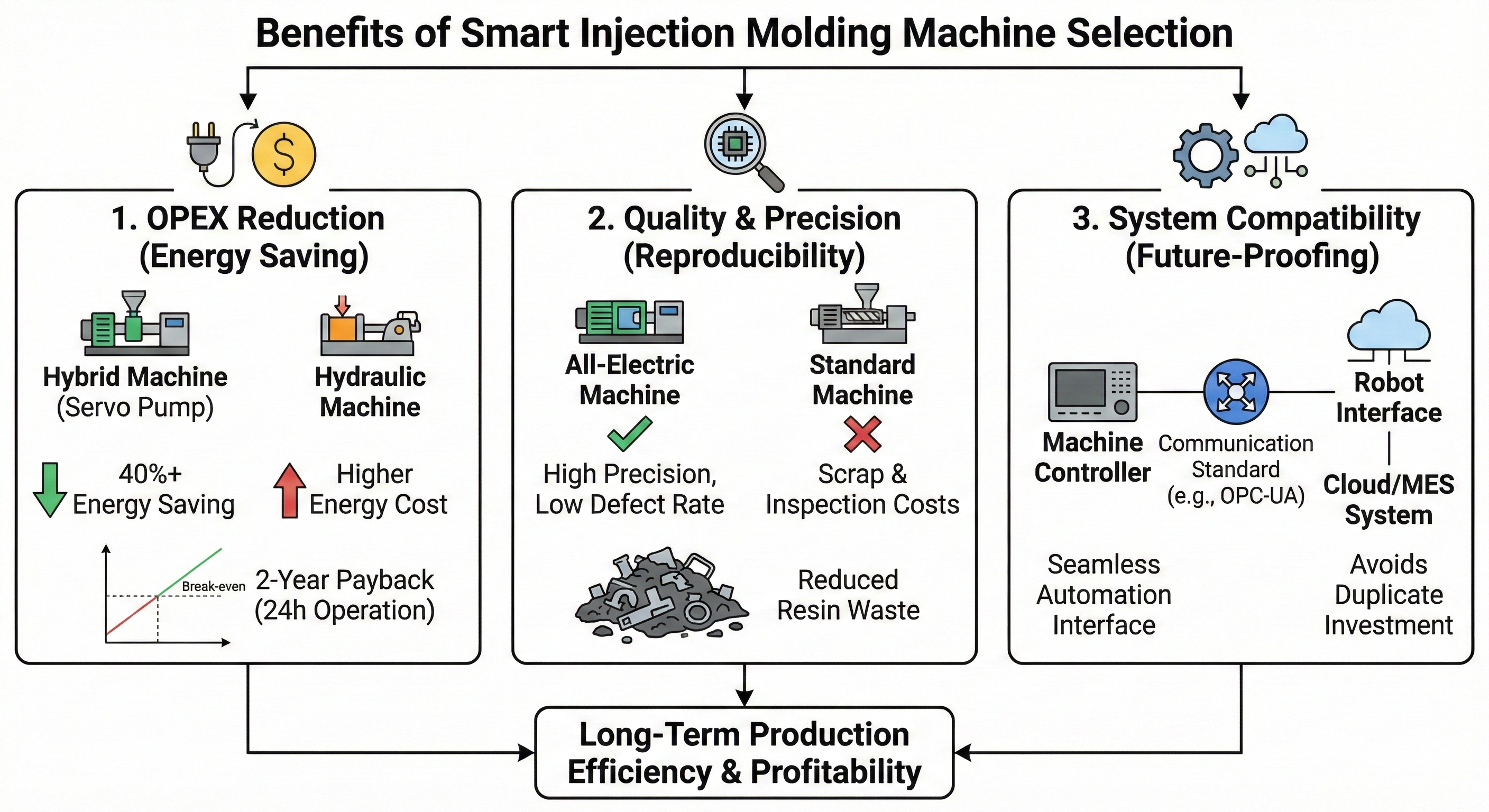 사출성형기는 한 번 도입하면 최소 10년 이상 가동해야 하는 핵심 자산입니다. 단순히 장비의 가격이나 브랜드 인지도에 의존하여 모델을 선정할 경우, 생산 현장에서 금형 장착 불가, 불량률 폭증, 과도한 에너지 비용 발생 등의 심각한 리스크를 초래할 수 있습니다. 본 가이드는 현명한 사출기 모델 선정을 위해 반드시 숙지해야 할 기계적 근거와 산업별 최적화 포인트를 심층적으로 다룹니다.