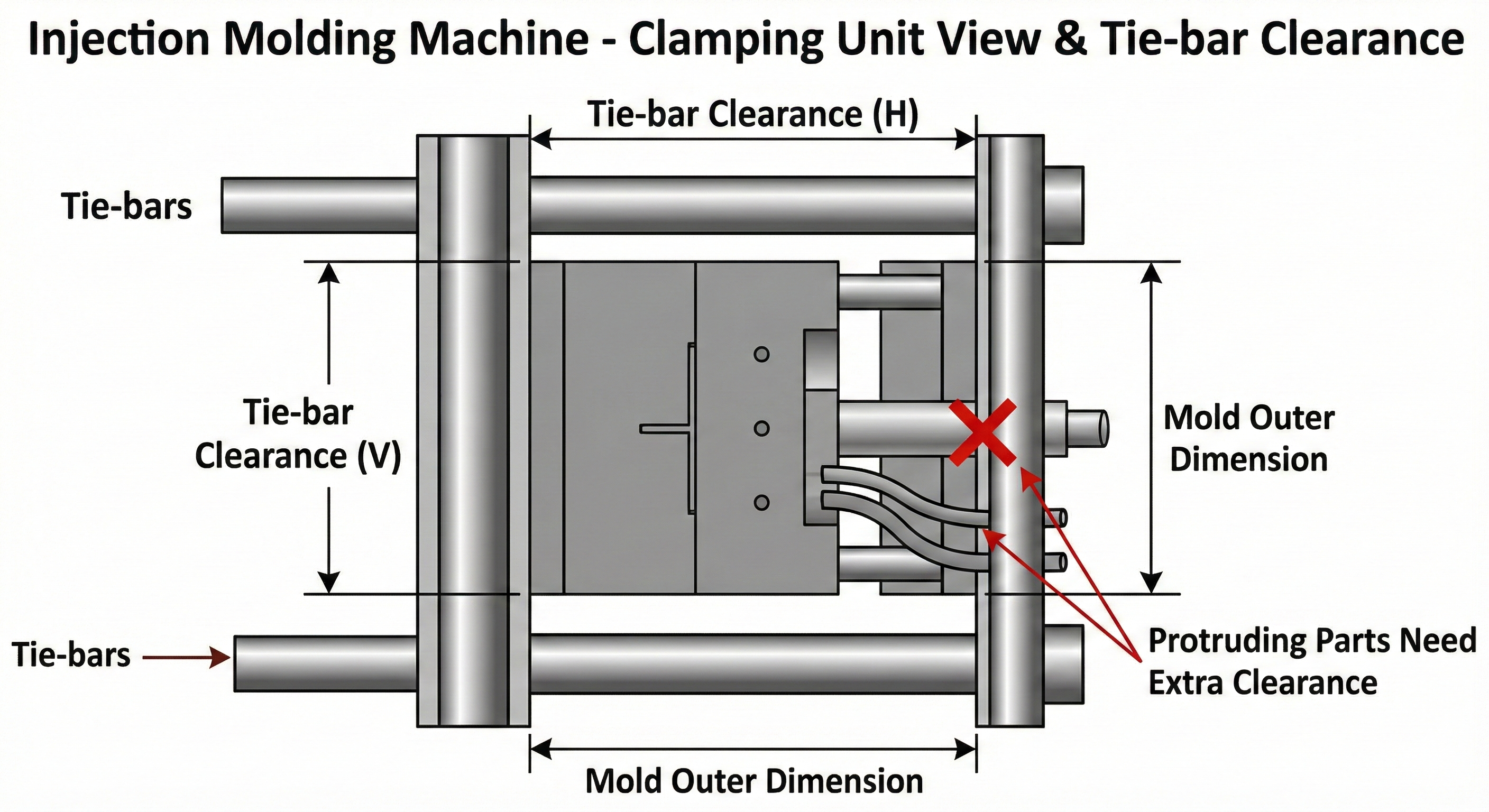 타이바는 형체 장치를 지탱하는 4개의 기둥입니다. 이 기둥 사이의 간격이 금형의 외형 치수보다 작으면 금형을 기계 안으로 밀어 넣을 수 없습니다. 특히 슬라이드 코어나 냉각 호스 연결 부위가 외부로 튀어나온 금형의 경우, 실제 금형 판 사이즈보다 훨씬 넓은 타이바 간격을 가진 모델을 선정해야 합니다.