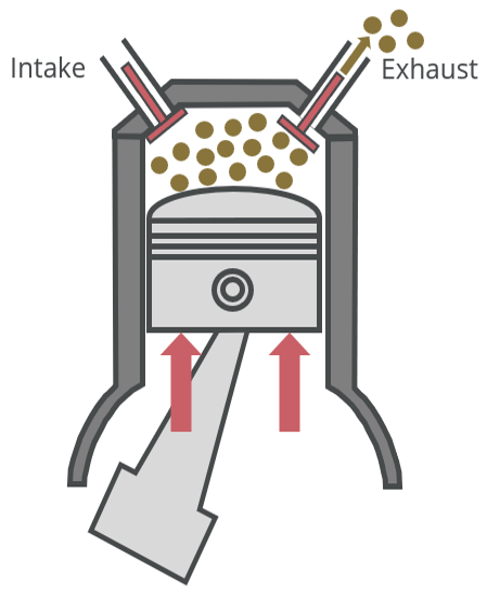 배기(Exhaust): 폭발 후 하사점으로 하강한 피스톤이 다시 상사점으로 상승하면서 내부의 연소 가스를 외부로 배출하는 과정입니다. 피스톤이 상승할 때 닫혀 있던 배기 밸브가 열리고, 연소 가스를 밀어 올려서 실린더 밖으로 배출 시킵니다.