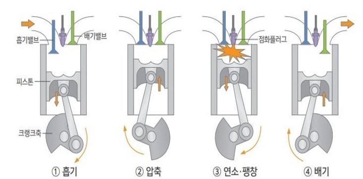 오늘날의 자동차 엔진은 흡기, 압축, 폭발(연소 또는 팽창), 배기를 한 cycle로 동작하는 이른바 4행정을 반복하여 작동합니다. 여기서 ‘행정 (行程)’은 위, 아래의 한 방향에서 실린더 안의 피스톤이 모두 움직이는 것을 의미합니다. 4행정은 흡기->압축->폭발->배기 순서대로 작동하며, 피스톤이 실린더 내부의 사장 높은 곳에 위치할 때를 상사점, 가장 낮은 곳에 위치할 때를 하사점이라고 합니다.