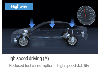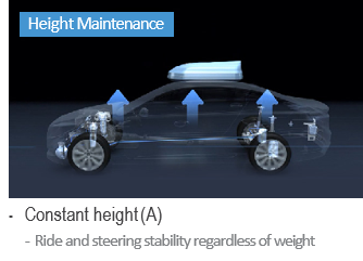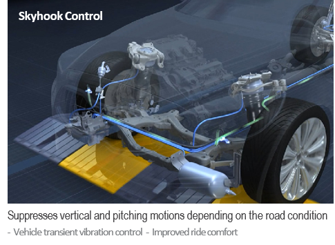 아울러 여기서 모비스는 에어서스펜션 시스템 기술을 응용하여 한 단계 업그레이드 된 프리뷰 에어서스펜션 시스템을 개발하였습니다. 프리뷰 에어서스펜션은 내비게이션에서 도로 정보를 읽고, 스스로 차량 높이를 조절하고 노면의 충격을 흡수합니다. 또한 전방에 어린이보호구역이 있을 때 시야 확보를 위해 차량 높이를 높이거나 낮추기도 하고, 철길이나 과속방지턱 등의 거친 노면에서는 차체가 받는 진동과 충격을 감소 시켜주기도 합니다. 요약하자면 주행 환경에 맞춰 최적화된 승차감을 제공하는 서스펜션이죠.
