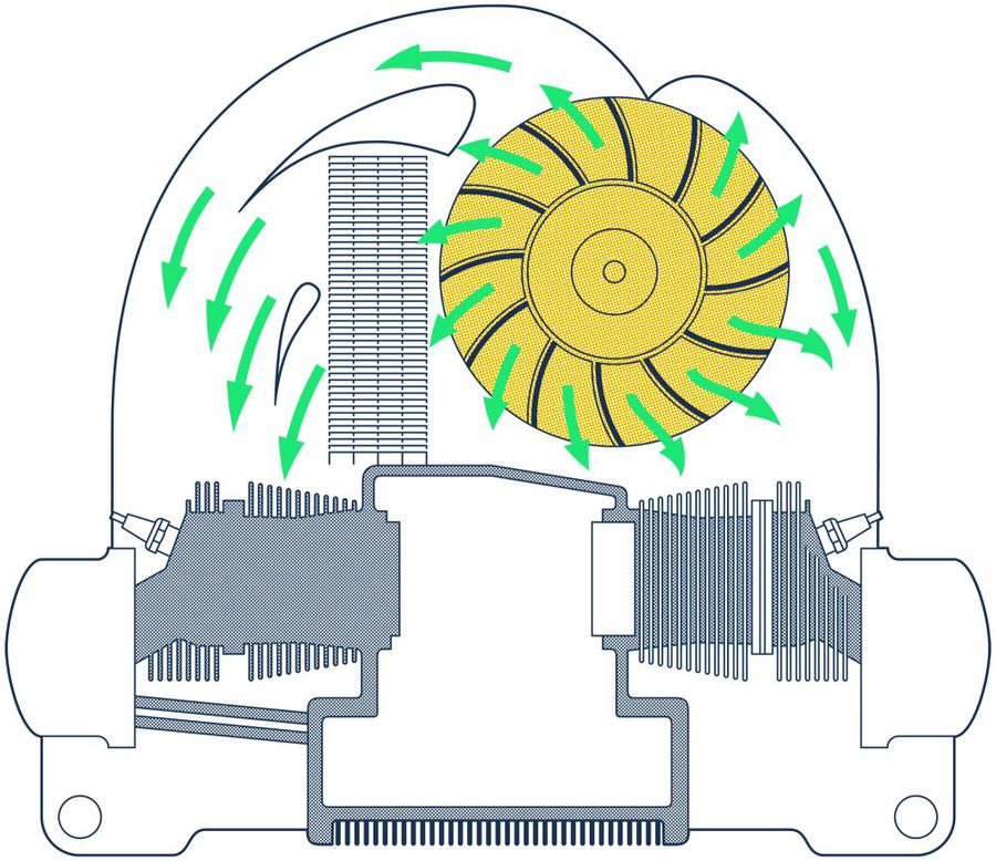 공냉식 시스템은 공기의 흐름에 의해 열이 외부로 전달 되는 방식으로, 얇고 넓은 형태의 알루미늄 핀을 엔진 블록에 장착하여 이 알루미늄 핀이 실린더의 열을 흡수하고, 외부의 공기로 이 핀의 열을 제거하는 방식으로 엔진을 냉각시킵니다. 보다 효율적인 냉각을 위해 실린더와 실린더 헤드 주변에 핀을 장착하여 외부 공기의 접촉 면적을 넓히는 것이죠. 냉각수 등의 액체가 없기 때문에 추운 날씨의 균열이나 손상의 위험, 매우 더운 날씨의 액체 증발 등의 위험이 없어 사막이나 북극과 같은 극단적인 기후 조건에서도 문제 없이 사용 할 수 있습니다. 공냉식은 대부분 마력이 낮은 트랙터, 오토바이, 스쿠터, 소형차 또는 기계의 운동 속도가 엔진 냉각에 효율적인 출력을 내는 소형 항공기 엔진 등에서 사용합니다.