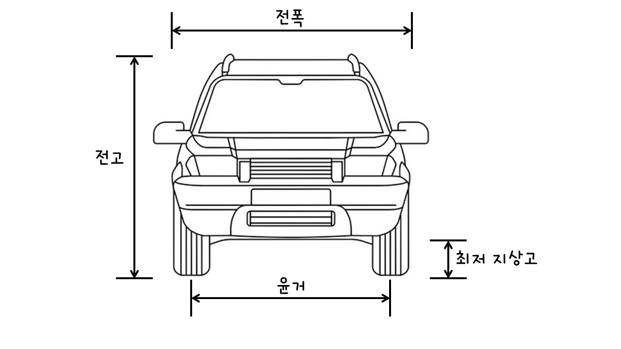 -축거(휠베이스): 앞바퀴와 뒷바퀴의 중심 간 거리이며 자동차의 레이아웃을 결정하는 치수입니다